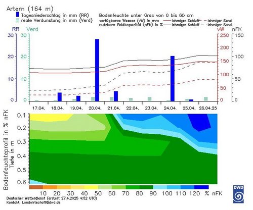 In einigen Regionen im Arbeitsgebiet waren die Böden teilweise deutlich ausgetrocknet. Am Beispiel Artern kann sehr gut erkannt werden, dass die nFK im Bereich von 40 Prozent angelangt war und damit im extrem kritischen Bereich lag. Die Niederschläge über Ostern und im Laufe der vergangenen Woche haben deutlich für Entspannung gesorgt.