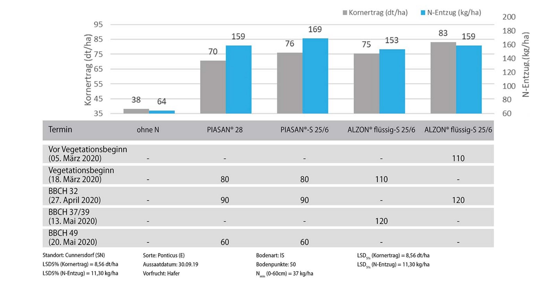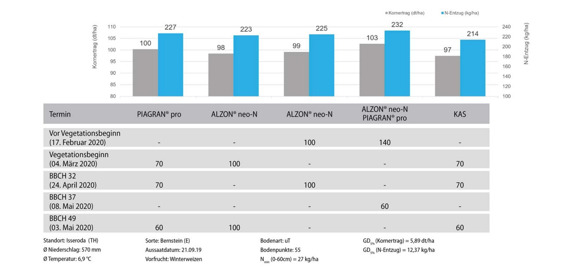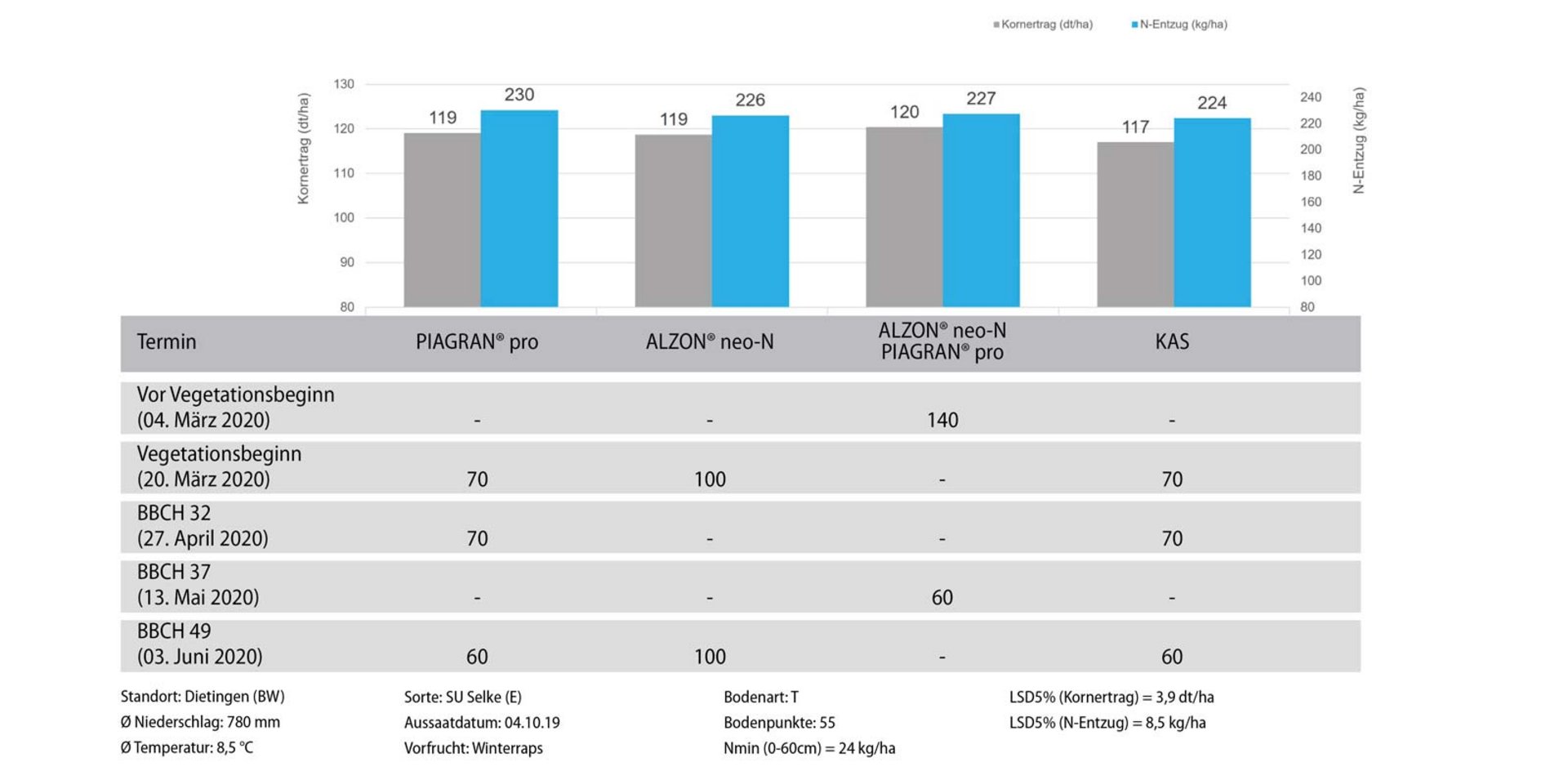Die frühe Startdüngung vor Vegetationsbeginn und eine frühe Schossgabe mit ALZON® neo-N wirken sich an einem wasserlimitierten Standort positiv auf den Ertrag aus. Ebenso positiv im Ertrag zeigt sich das „Baukastensystem“ mit 70 % Andüngung vor Vegetationsbeginn mit ALZON® neo-N und 30 % Qualitätsgabe mit PIAGRAN® pro. Dank ammoniumbetonter Ernährung überwachsen die Bestände nicht. Die Anschlussdüngung kann je nach Witterungssituation flexibel in der Schossphase gestaltet werden.