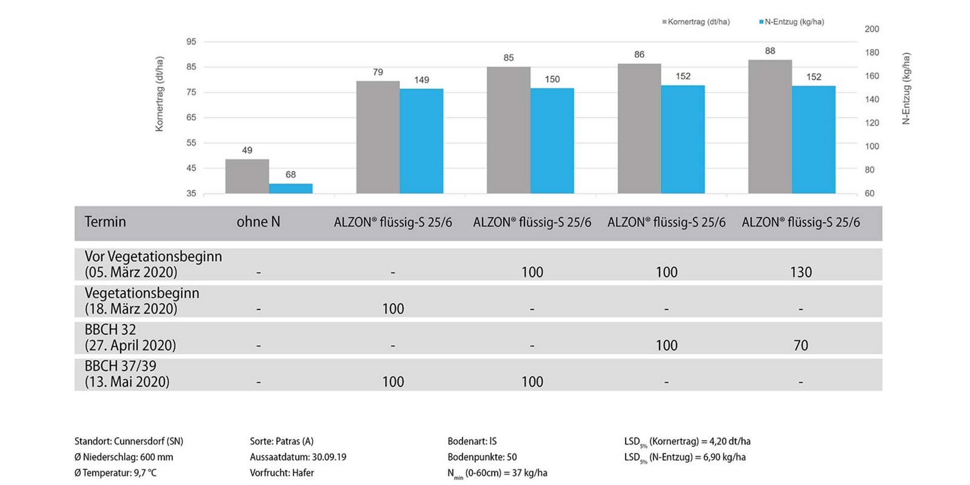 Die kombinierte Applikation von Stickstoff und Schwefel mit Flüssigdüngern steigert den Ertrag. Frühe Applikationstermine beim Einsatz von ALZON® flüssig-S 25/6 waren 2020 vorteilhaft.