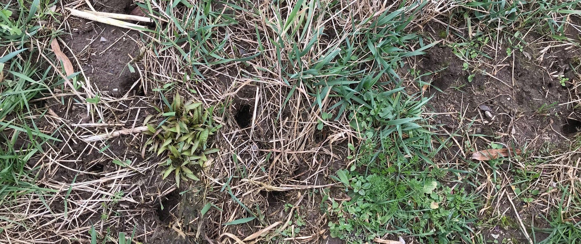 Feldmäuse treten dieses Jahr lokal stärker auf. Raps- und pfluglos bestellte Wintergetreideflächen mit Vorkultur Getreide oder Raps sowie Wiesen und Weiden sollten deshalb auf Befall kontrolliert werden. Häufig ist der Ausgangsbefall an den Feldrändern zu beobachten (Bild). Dieser ist jetzt bei der niedrigen Vegetation gut festzustellen. Ob Bekämpfungsmaßnahmen erforderlich sind, ist mit Hilfe der „Lochtretmethode“ ermittelbar. Dabei werden auf einer Fläche von 2 x 250 m² (16 x 16 m) alle Mauselöcher zugetreten. Nach 24 Stunden werden die wieder geöffneten Löcher gezählt. Wichtig: Der Bekämpfungsrichtwert liegt für Wintergetreide und Raps bei 5 bis 8 und bei Grünland bei 11 geöffneten Löchern je Kontrollfläche.