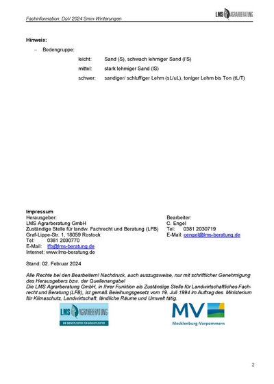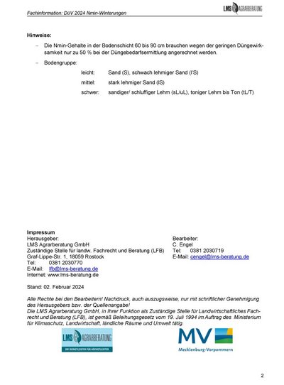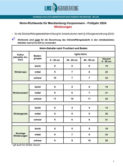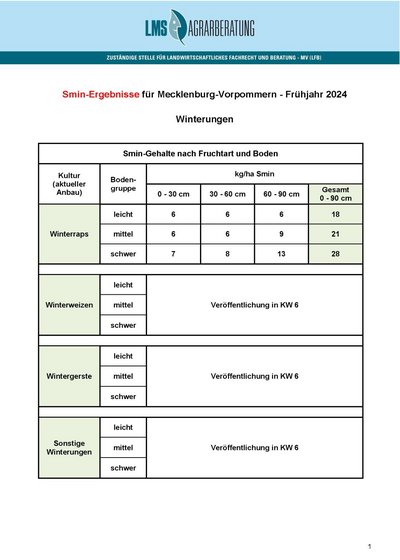 Nach den sehr feuchten Winterbedingungen sind die Smin-Gehalte auf vielen Standorten gerade in den oberen Bodenschichten recht gering. Einen Überblick über die aktuellen Smin-Gehalte der Böden in Mecklenburg-Vorpommern gibt die Fachinformation der LMS Agrarberatung GmbH - LFB. Derzeitig liegen bereits die Smin-Werte für den Winterraps vor: