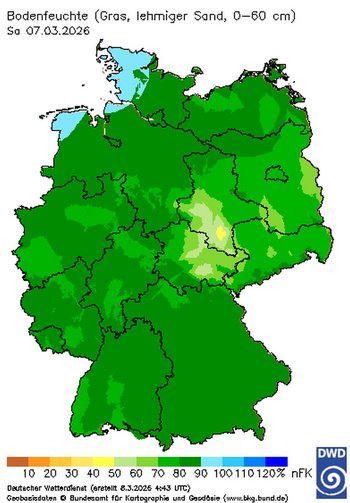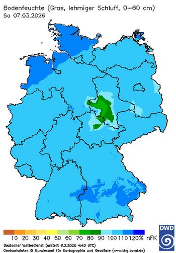Das trockene Wetter hat in den letzten Tagen für deutlich verbesserte Bedingungen der anstehenden Feldarbeiten gesorgt. Auf den leichten Standorten lag am 7. März die nutzbare Feldkapazität in der oberen Bodenschicht bis 60 cm laut Deutschem Wetterdienst im Nordosten mittlerweile zwischen 80 bis 90 Prozent.