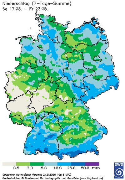 Vom 17. bis zum 23. Mai sind laut Deutschem Wetterdienst zwischen 2 bis 20 mm Regen im Nordosten gefallen. In den Regionen mit den höheren Niederschlagsmengen sorgt dies für eine leichte Entspannung der kritischen Situation der Bodenfeuchtigkeit. Leider waren in der letzten Woche gerade auf den leichten Standorten im Südwesten Mecklenburgs kaum Niederschläge zu verzeichnen, sodass hier die Situation der Feldbestände auf Grund der anhaltenden Trockenheit weiterhin sehr kritisch bleibt.