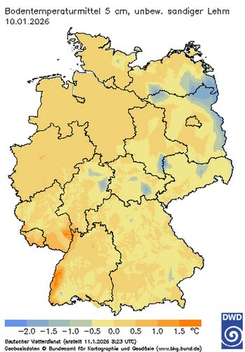 Derzeit liegt das Bodentemperaturmittel in 5 cm Höhe laut Deutschem Wetterdienst (DWD) am 10. Januar im Nordosten knapp unter dem Gefrierpunkt.