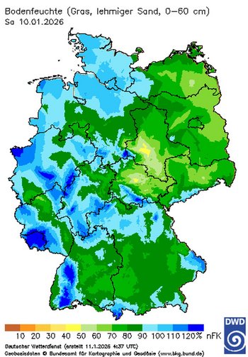 Im Dezember fielen die Niederschläge überwiegend verhalten aus und die Bodenwassersituation konnte in den meisten Regionen nicht verbessert werden. Aktuell erreichen die Bodenfeuchten laut DWD am 10. Januar in den Bodenschichten von 0 bis 60 cm auf den leichteren Böden mit 80 % nFK einen für diese Jahreszeit deutlich unterdurchschnittlichen Wert.