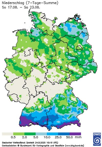 Nach der Trockenphase der letzten Wochen hat es nun endlich am vergangenen Freitag und Samstag etwas geregnet. So lagen die Niederschlagsmengen im Nordosten vom 17. bis zum 23. August zwischen 2 bis 15 mm.