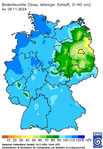 Auch die Situation der Bodenfeuchtigkeit erreicht am 9. November laut DWD im Bereich von 0 bis 60 cm auf den besseren Böden in diesen Regionen mit 80 bis 100 Prozent nFK relativ hohe Werte.