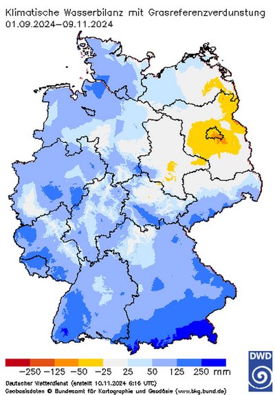 Die Niederschläge im Herbst haben für eine weitestgehend entspannte Wassersituation in vielen Regionen gesorgt. Aktuell weist die klimatische Wasserbilanz des Deutschen Wetterdienstes (DWD) für den Zeitraum vom 1. September bis zum 9. November für die westlichen und nördlichen Landesteile eine deutlich positive Bilanz aus.