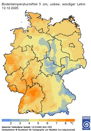 Nach dem winterlichen Wetter im November mit einer vorläufigen Vegetationsruhe kommen die Feldbestände bei den sehr milden Temperaturen momentan nicht zur Ruhe. Laut Deutschem Wetterdienst (DWD) lag am 12. Dezember das aktuelle Bodentemperaturmittel in 5 cm Höhe im Nordosten um die 6 °C.
