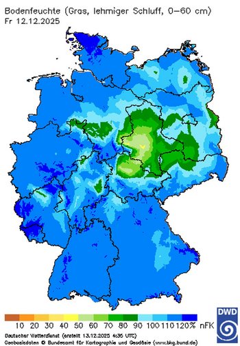 Diesen Eindruck bestätigen auch die aktuellen Werte des Deutschen Wetterdienstes. So erreichten die Bodenfeuchten am 12. Dezember in den Bodenschichten von 0 bis 60 cm auf den besseren Böden mit 90 bis 110 % nFK sehr hohe Werte.