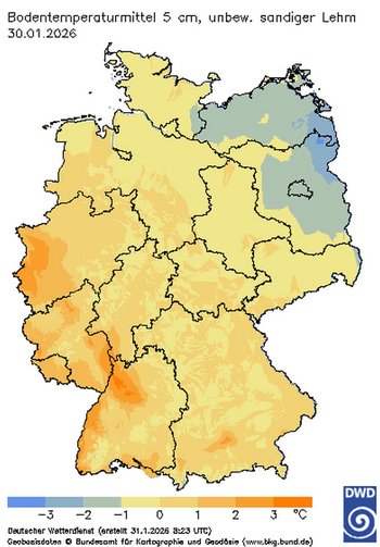 Die Böden sind weiterhin durchweg gefroren und die Bodentemperatur in fünf Zentimeter Höhe lag laut Deutschem Wetterdienst am 30. Januar im Nordosten um die -2 °C.