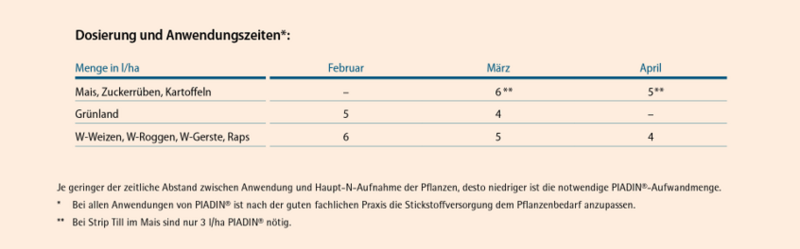 Bei der Ausbringung von Gülle oder Gärsubstraten sollte unbedingt auf eine Stabilisierung des Ammoniumstickstoffs geachtet werden. Der Einsatz von PIADIN® bietet dafür eine langjährig bewährte Technologie. Durch den im Produkt enthaltenen Nitrifikationsinhibitor wird eine ammoniumbetonte Pflanzenernährung gewährleistet und mögliche Nitratverlagerungen werden dadurch nachhaltig minimiert. Die Aufwandmengen richten sich nach dem Anwendungszeitpunkt der zu düngenden Kultur und sind in der obenstehenden Abbildung aufgeführt.