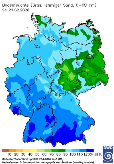Mit den Niederschlägen der letzten Wochen hat sich die Bodenwassersituation in der oberen Bodenschicht bis 60 cm laut Deutschem Wetterdienst am 21. Februar deutlich verbessert. So lagen im Nordosten die nutzbaren Feldkapazitäten auf den leichten Böden zwischen 80 bis 100 Prozent und auf den besseren Böden flächendeckend bei 100 Prozent.