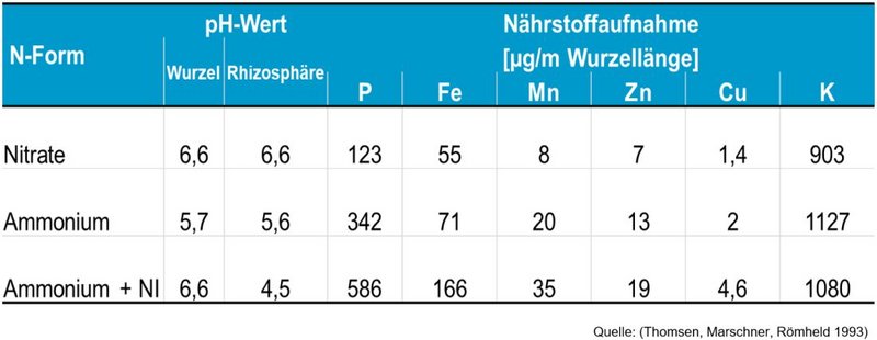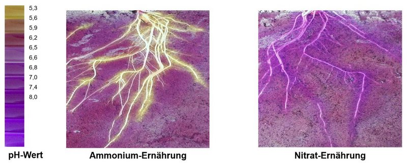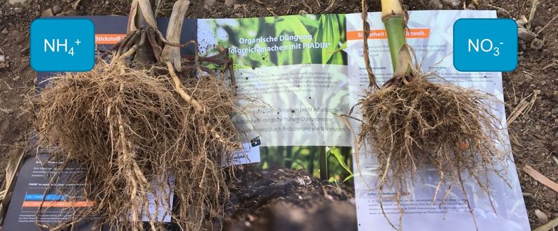 Eine ammoniumbetonte Ernährung in der frühen Entwicklungsphase des Maises fördert deutlich die Bildung von Seitenwurzeln. Dadurch verbessert sich für die Pflanze sowohl die Wasseraufnahme als auch die Aufnahme von Nährstoffen. Gleichzeitig führt eine ammoniumbetonte Ernährung zu einer Absenkung des pH-Wertes in der Rhizosphäre, also im unmittelbaren wurzelnahen Bereich von etwa drei Millimetern. Infolgedessen wird die Aufnahme von Phosphat sowie von Spurennährstoffen wie Eisen (Fe), Mangan (Mn), Zink (Zn) und Kupfer (Cu) erhöht.