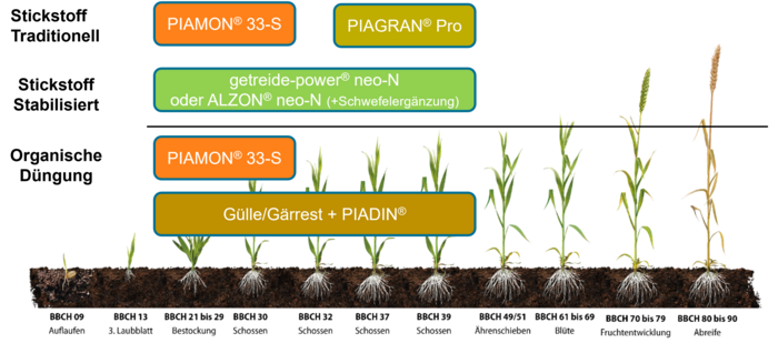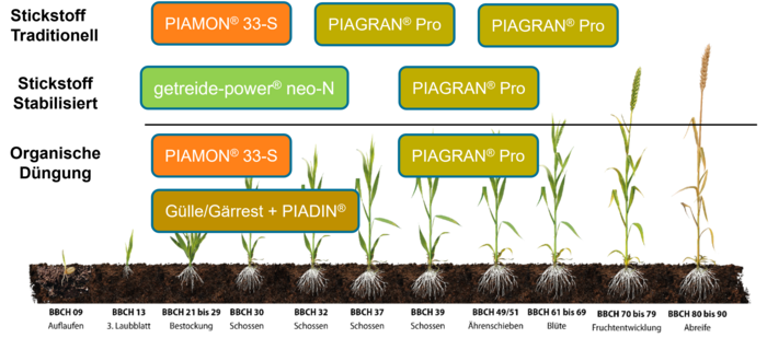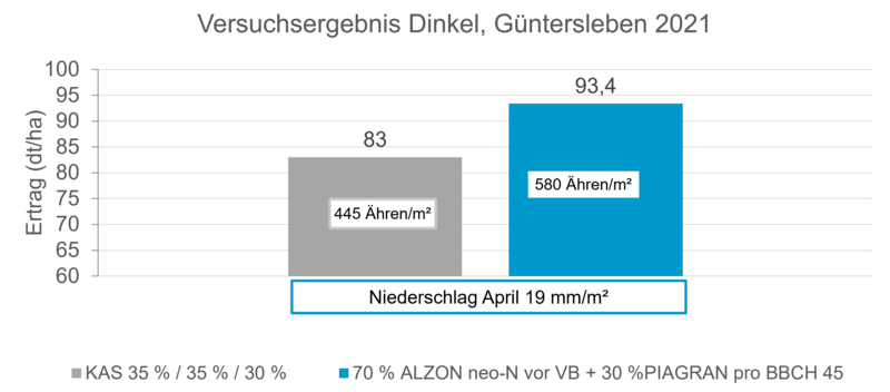 Entscheidend für ein optimales Pflanzenwachstum ist, dass sich die benötigte Stickstoffmenge zur richtigen Zeit in der Bodenschicht befindet, in der die Wasseraufnahme stattfindet. An nicht wenigen Standorten sank die Bodenfeuchte in den letzten Jahren schon im April auf unter 40 Prozent der nutzbaren Feldkapazität. Unter solchen Bedingungen kann sich bereits die zweite Stickstoffgabe nicht mehr optimal im Boden verteilen. Wer ammoniumstabilisierte Dünger anwendet, kann diese Phase umgehen, indem er das erst reichliche, dann rasch verschwindende Wasserangebot rechtzeitig mit einer erhöhten Startgabe bzw. Einmalgabe ausnutzt.