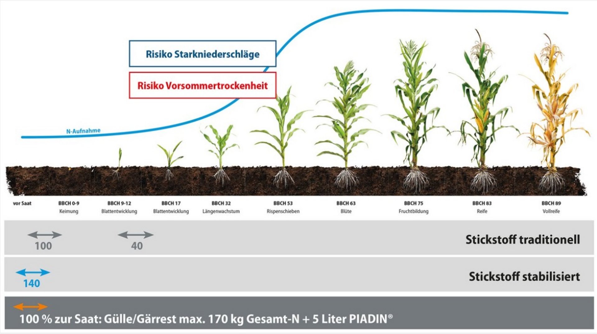 In vielen Regionen von Nordrhein-Westfalen und Niedersachsen fällt dem Maisanbau eine entscheidende Rolle in der Fruchtfolge zu. Sobald die Witterung etwas trockener und die Böden wieder befahrbar werden, beginnen die Vorbereitungen für die Maisaussaat. Angefangen von der Zerkleinerung und Einarbeitung der Zwischenfrüchte, über die (wendende, mischende oder minimale) Bodenbearbeitung bis hin zu Aussaat und Düngung ist dabei vieles zu beachten. Da der Mais in der Jugendentwicklung nur einen geringen Stickstoffbedarf hat, bietet sich hier eine stabilisierte Düngung an, um Nitratverlusten durch Auswaschung und Denitrifikation entgegen zu wirken und damit die Grundlange für hohe Erträge und Qualitäten zu schaffen. Vor allem nach früh ausgebrachter Gülle ist dies wichtig, da von Anfang April durchaus acht bis zehn Wochen vergehen können, bis der Mais die großen Stickstoffmengen aufnehmen kann. Bei güllebetonten Düngestrategien bietet sich der Nitrifikationsinhibitor PIADIN® an. Dieser funktioniert sowohl bei einer ganzflächigen Einarbeitung der Gülle, wie auch bei Strip-Till (Aufwandmengen beachten) gleichermaßen hervorragend.