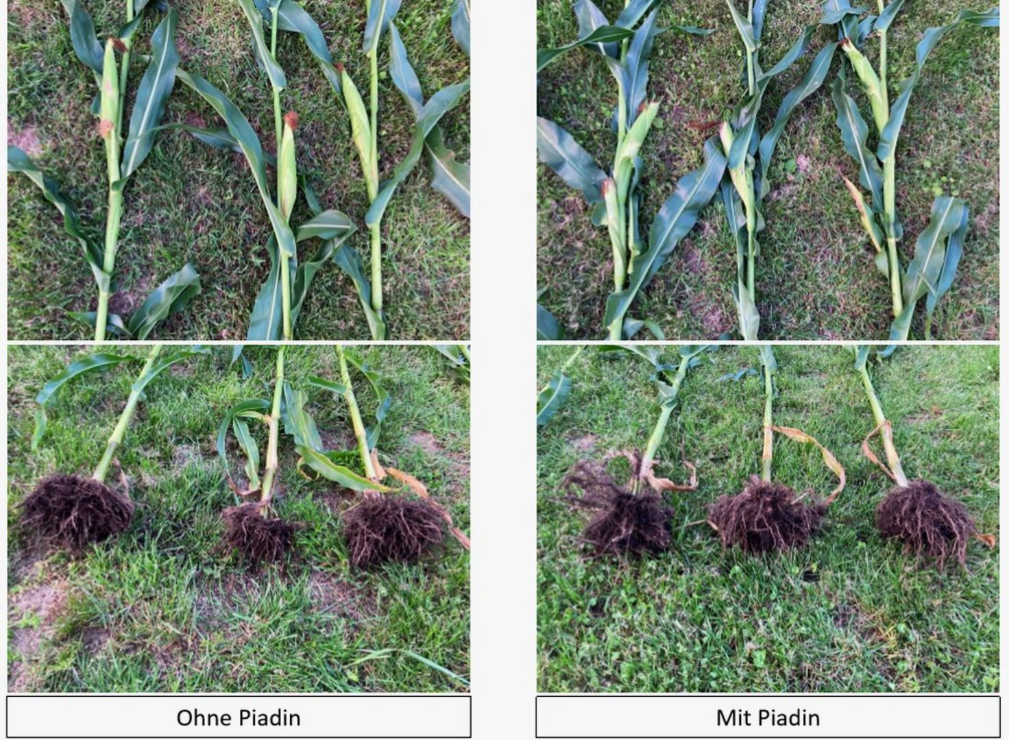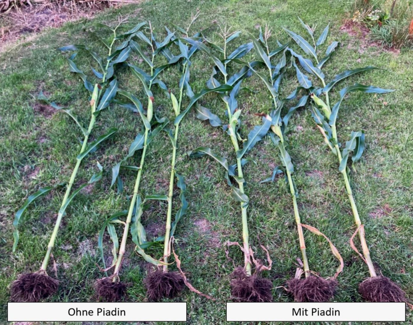 Der Mais zeigt sich in diesem Jahr fast überall von seiner besten Seite. Er hat seit seiner Aussaat Ende April kaum unter Trockenheit und Hitze gelitten. Auch Ende August sind die Bestände noch immer grün und bilden jeden Tag mehr Biomasse aus. Der für den Ertrag begrenzende Faktor ist in diesem Jahr seit langem mal nicht das Wasser, sondern die im Boden vorhandenen Nährstoffe. Auch unter diesen Bedingungen zeigen sich schon bei einem optischen Vergleich die Vorteile einer stabilisierten Düngung (in diesem Fall Stabilisierung von Schweinegülle mit PIADIN®).
