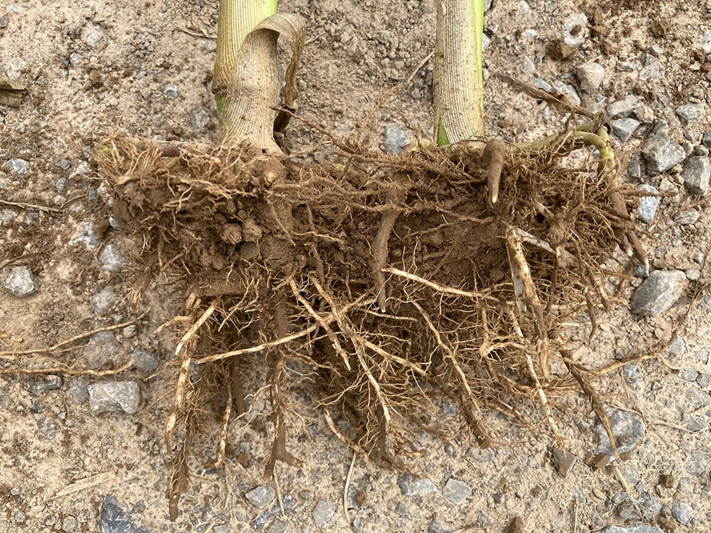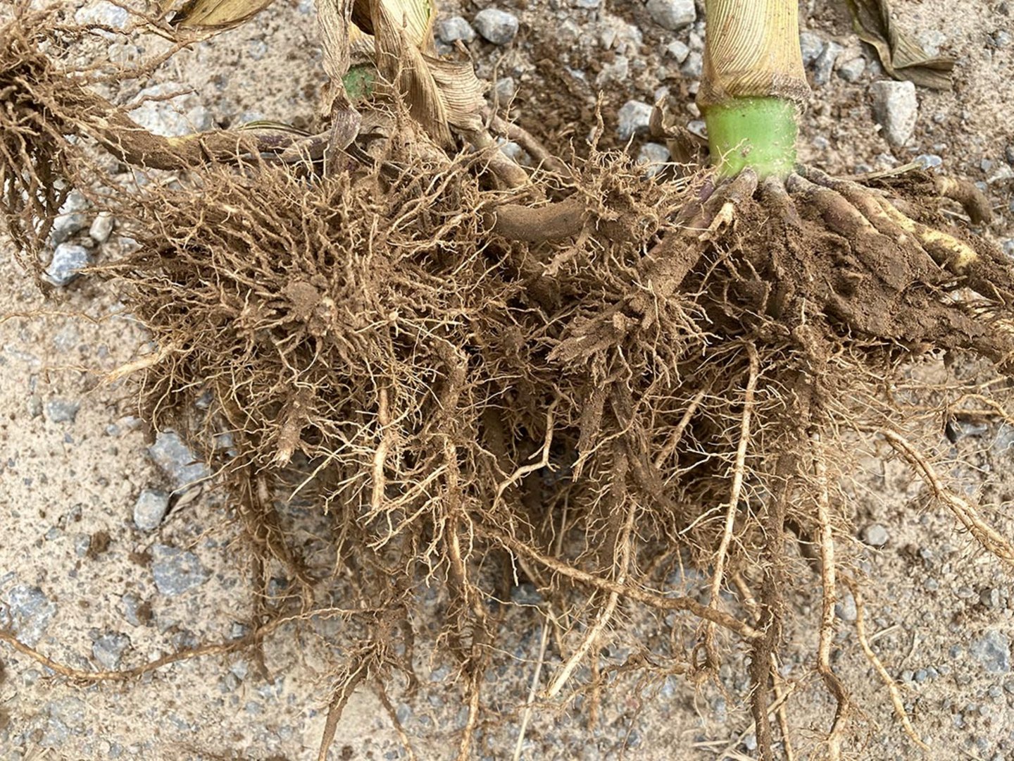 Folgend ein Beispiel mit PIADIN® aus einem Gebiet mit ausreichend Niederschlägen. Der Bestand steht auf einer Fläche mit gut versorgtem Boden mit Lössauflage. Neben 15 Kubikmeter Schweingülle und einem Phosphorreduzierten Dünger als Unterfuß ist noch eine Kopfdüngung mit ASS gefallen, in Summe 160 kg N/ha. Bei der Variante mit PIADIN® zeigt sich ein sehr deutlicher Unterschied im Wurzelwachstum, was sich auch auf die Gesamtpflanze ausgewirkt hat. Der Einsatz erfolgte 14 Tage vor dem Legen mit einem Aufwand von 5 Liter je Hektar.