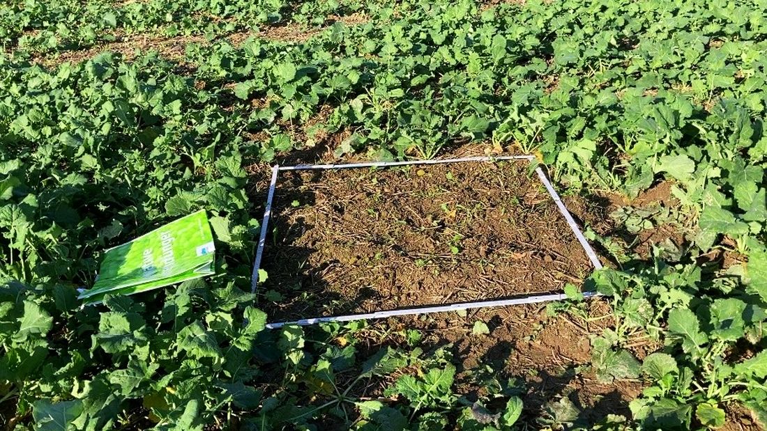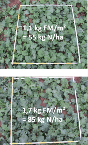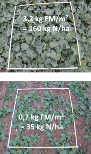 In der Vegetationsruhe ist es hilfreich, die aufgenommene Stickstoffmenge im Raps zu bestimmen. Dies geht sehr einfach mit zwei Zollstöcken einem Behälter, einem Rasenkantenschneider und einer herkömmlichen Küchenwaage. Man schneidet quer über den Schlag drei bis viermal einen Quadratmeter an Frischmasse direkt über dem Boden ab und wiegt sie. Die Faustregel besagt: Bei 1 Kg Frischmasse hat die Pflanze ca. 50 Kg N aufgenommen.