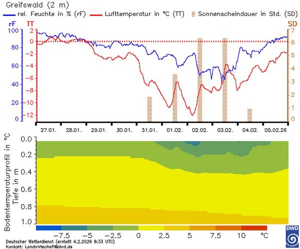 Zusammen mit den Minusgraden bis in 80 cm Bodentiefe sind noch keine Anzeichen für eine beginnende Pflanzenvegetation beziehungsweise Befahrbarkeit zur Düngung gegeben.