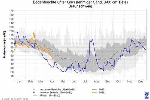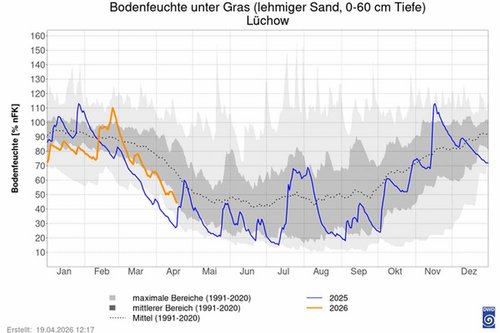 Auch wenn es teilweise wieder recht staubig auf den Feldern zugeht, so ist die Bodenfeuchte im Jahresvergleich an vielen Stellen höher als in dem vergangenen Jahr. Sie erreicht jedoch nicht das Mittel aus den Jahren 1991-2020 und befindet sich eher am unteren Bereich der mittleren Werte.