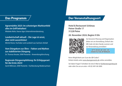 Mit Ende der Maßnahmen im Feld steht auch wieder die Saison der Winterveranstaltungen vor der Tür. Auch ich möchte Sie herzlich zu unserer Fachtagung Düngung am 28. November 2024 in Peine einladen. Seien Sie gespannt auf Vorträge rund um das Thema Düngung und zur aktuellen Situation in der Landwirtschaft. Jetzt kostenfrei anmelden und informieren. Gerne können Sie mich auch direkt kontaktieren.