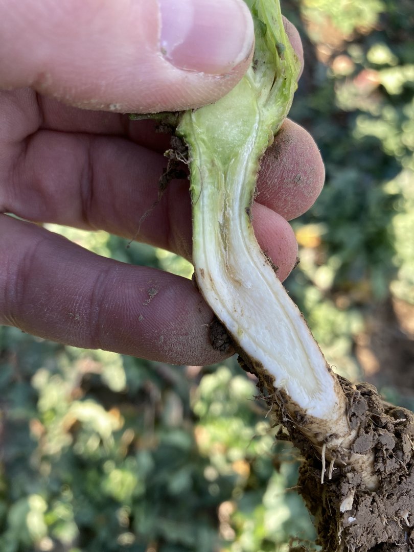 Beim Raps ist ebenfalls zu verzeichnen, dass dieser aufgrund der milden Temperaturen innerhalb der letzten Tage gut gewachsen ist und kurz vor dem Schossen bzw. im Übergang in dieses ist. Schaut man sich die Wurzeln genauer an, ist bereits jetzt in vielen Bereichen das Auftreten von beginnender Hohlherzigkeit zu verzeichnen.