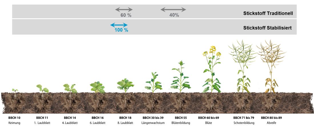 Diese Überversorgung kann durch eine Düngung mit stabilisiertem Stickstoff vermieden werden, da die Umsetzung von Ammonium zu Nitrat verzögert wird. Diese Umsetzung ist temperaturabhängig, was dafür sorgt, dass die Pflanze während ihres Wachstums bedarfsgerecht ernährt wird. Des Weiteren ist Ammonium durch die Bindung an die Ton-Humus-Komplexe deutlich ungefährdeter was die Verlagerung im Boden betrifft. Dies hat gleich mehrere Vorteile: zum einen sinkt die Gefahr von Nitratauswaschungen in den Grundwasserkörper, aber auch gasförmige Verluste durch die Denitrifikation werden verhindert. Außerdem bringt die frühe Düngung und damit die Ausnutzung der Winterfeuchtigkeit eine deutliche Absicherung gegen Wetterextreme wie Frühjahrstrockenheit. Durch die frühe Applikation befinden sich bei späterer Trockenheit die Nährstoffe in der Ackerkrume und sind damit pflanzenverfügbar.