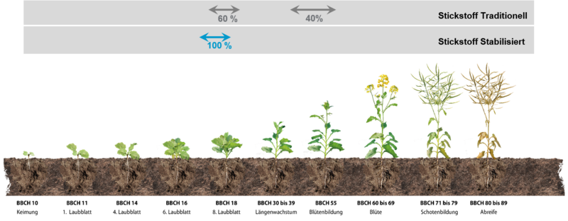Diese Überversorgung kann durch eine Düngung mit stabilisierten Stickstoff vermieden werden, da die Umsetzung von Ammonium zum Nitrat verzögert wird. Diese Umsetzung ist temperaturabhängig, was dafür sorgt, dass die Pflanze während ihres Wachstums bedarfsgerecht ernährt wird. Des Weiteren ist Ammonium durch die Bindung an die Ton-Humus-Komplexe deutlich ungefährdeter was die Verlagerung im Boden betrifft. Dies hat gleich mehrere Vorteile: Zum einen sinkt die Gefahr von Nitratauswaschungen in den Grundwasserkörper aber auch gasförmige Verluste durch die Denitrifikation werden verhindert. Zum anderen bringt die frühe Düngung und damit die Ausnutzung der Winterfeuchtigkeit eine deutliche Absicherung gegen Wetterextreme wie Frühjahrstrockenheit. Durch die frühe Applikation befinden sich bei späterer Trockenheit die Nährstoffe in der Ackerkrume und sind damit pflanzenverfügbar.