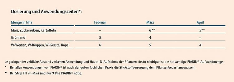 Sofern in den nächsten Tagen die Flächen bearbeitet werden können und teilweise auch die Güllewagen über den Acker rollen, ist eine organische Düngung mit PIADIN® zu empfehlen. PIADIN® ist ein Produkt, welches die Ammoniumstabilisierung in Gülle und Gärresten übernimmt und so eine bedarfsgerechte Ernährung gerade im Jugendstadium der aktuellen Sommerungen gewährleistet. Die Beimischung ins Fass sollte im besten Falle über einen Bypass erfolgen.