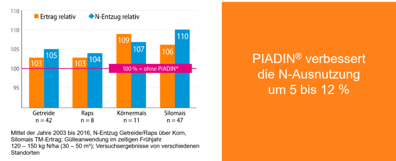 Sollte ein Betrieb mit ALZON® neo-N arbeiten, kann dieser auch bei zeitnaher Düngung seine Gülle mit stabilisieren. Dies funktioniert aber nur ab 80 Kilogramm Stickstoff aus ALZON® neo-N. Dies ist mit einer Wirkstoffmenge von fünf Litern pro Hektar des Stabilisators PIADIN® vergleichbar. Bei vielen viehstarken Betrieben lässt die Düngemittelverordnung oft keine hohen Mineraldüngergaben mehr zu. Es besteht aber eine Möglichkeit, ALZON® neo-N und PIADIN® zu kombinieren. Zum Beispiel bei 20 m3 pro Hektar Gülle und zeitnah 60 Kilogramm Stickstoff pro Hektar über ALZON® neo-N fehlen noch zwei Liter PIADIN® pro Hektar, um die kombinierte Wirkung zu ermöglichen. Es sollte aber darauf geachtet werden, dass die Nitrifikationsinhibitoren zusammenpassen!