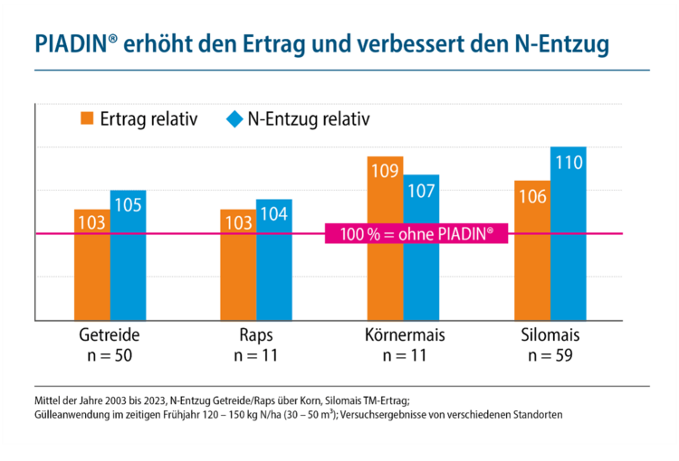 Mehrjährige unabhängige Studien belegen, dass durch die Zugabe von PIADIN® zu Gülle und Gärresten Nitratauswaschungen um bis zu 50 Prozent reduziert werden können und das sehr klimaschädliche Lachgas um bis zu 75 Prozent weniger emittiert wird. Außerdem ist die sehr gute Verträglichkeit mit Boden und Natur zu erwähnen.