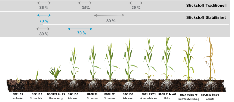 Durch die Niederschläge und Schneeschmelze der letzten Wochen ist mit wenig Nmin und Smin im Boden zu rechnen. So werden mobile Nährstoffe wie Stickstoff und Schwefel in tiefere Bodenschichten verlagert. Dies ist besonders auf leichteren und flachgründigen Standorten zu beobachten. Darum sollte zur Andüngung der Pflanzennährstoff Schwefel nicht vergessen werden.