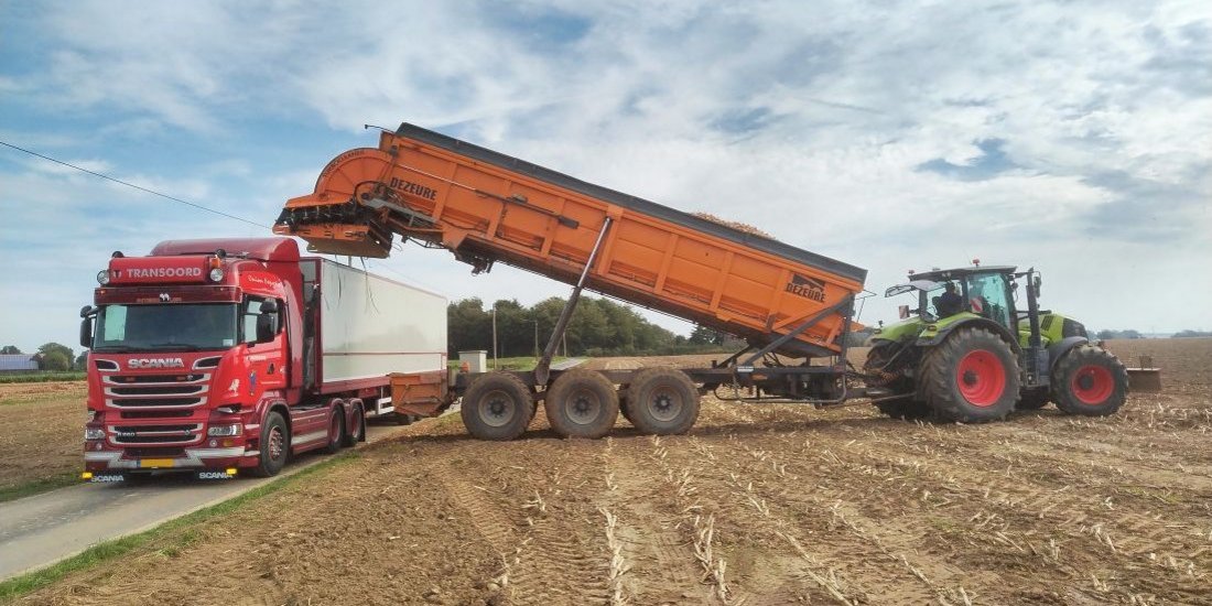 Für die weitere Logistik und die Weiterverarbeitung der Zwiebeln ist es förderlich beim Befüllen der Lkws die Zwiebeln über Erdwalzen laufen zu lassen (siehe Abbildung 6). So können über einen Sturzbunker oder, wie in der Abbildung 6 ersichtlich, über einen Überladewagen lose Zwiebelschalen und noch etwas Resterde vom Erntegut getrennt werden.