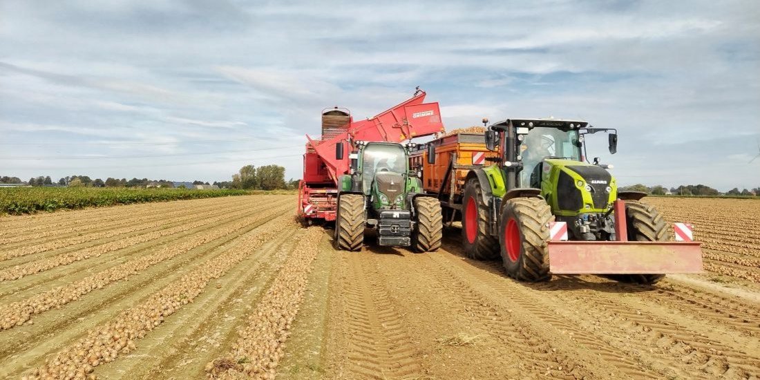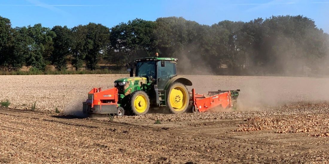 Der passende Zeitpunkt für das Schwadlegen ist, wenn ca. 90 Prozent der Laubblätter „erbraunt“ sind sowie trockenes Wetter für die Abtrocknung im Schwad und das Sammeln der Zwiebeln gemeldet ist (mindestens fünf Tage). Weiterhin ist es wichtig, dass beim Schwadlegen der Boden siebfähig ist und nicht schmiert. Wenn der Schwad trocken ist, können die Zwiebeln mithilfe eines Kartoffelroders mit angebauter Zwiebelaufnahme gesammelt werden. Dies ist in der Abbildung 5 dargestellt.