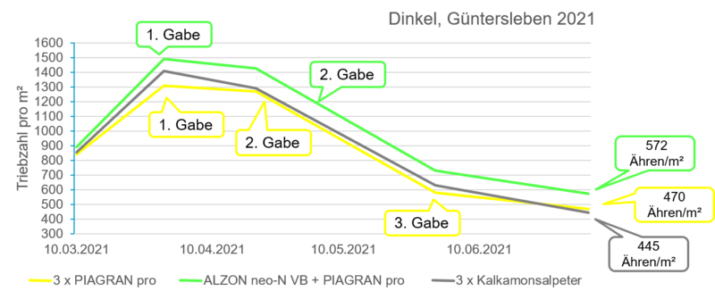 Der Dinkel quittierte dies mit einer Reduktion der Bestandsdichte, die dann letztendlich für deutlich niedrigere Erträge verantwortlich war (Abb. 4).