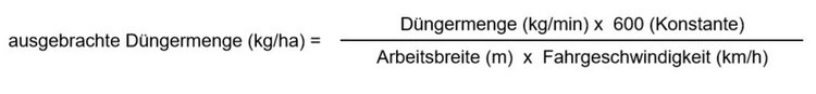 Bei der Abdrehprobe wird die Durchflussmenge aus beiden geöffneten Schiebern über eine bestimmte Zeit aufgefangen und gewogen. Die ausgebrachte Düngemenge wird dann wie folgt berechnet: