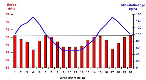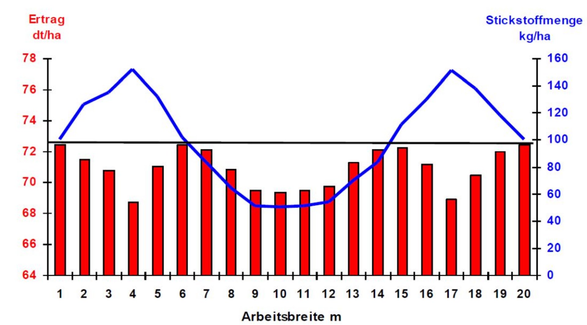Eine gute Querverteilung des Düngemittels und damit ein geringer Variationskoeffizient ist vor allem bei stickstoffhaltigen Düngemitteln zu beachten. Hier sind bei einem hohen Variationskoeffizienten (mehr als 20 %) deutliche Nährstoffüberschüsse auf der einen und Nährstoffmangelsituationen auf der anderen Seite im Bestand zu erkennen.