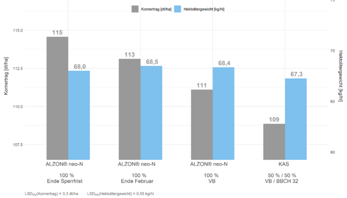 Es gilt also, die Wasservorräte des Winters intelligent für die Düngung zu nutzen und Applikationen in Trockenperioden zu vermeiden. Die N-stabilisierte Düngung als Einmalgabe zu Wintergerste und Winterroggen oder die Start-N-Gabe zu Winterweizen kann schon zwei bis vier Wochen vor Vegetationsbeginn (VB) erfolgen. Die zu diesem Zeitpunkt an jedem Standort ausreichend vorhandene Bodenfeuchte fördert eine rasche Auflösung des Düngers und die anschließende Infiltration und Verteilung im Wurzelbereich. Dank dem in den ALZON®-Produkten enthaltenen Nitrifikationsinhibitor wird die Pflanze bedarfsgerecht ernährt, ohne dass Verluste durch Nitratverlagerung oder in Form von Lachgas befürchtet werden müssten.