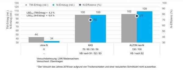 Beim Einsatz ammoniumstabilisierter Dünger ist auch im Grünland eine Zusammenfassung von Teilgaben möglich. So ließen sich mit ALZON® neo-N (Harnstoff + Urease- und Nitrifikationsinhibitor) in einem mehrjährigen Exaktversuch deutlich höhere Stickstoffentzüge als mit dem Standarddünger KAS erzielen (Abb. 1).
