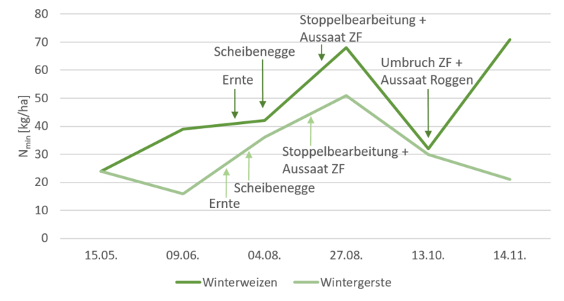 Eine Maßnahme, um N-Mineralisierungsraten zu reduzieren, ist der Anbau von Zwischenfrüchten (Abb. 1). Nach einer Bearbeitung mit der Scheibenegge nach Winterweizen und Wintergerste steigt zunächst der Nmin-Wert, jedoch wird dieser bei einer nachfolgenden Stoppelbearbeitung mit der einhergehenden Zwischenfruchtaussaat stark reduziert (Abb. 1). Nach der Wintergerste, wo die Zwischenfrucht stehen bleibt, sinkt der Nmin-Wert stetig weiter. Nach dem Winterweizen dagegen wurde die Zwischenfrucht nochmal umgebrochen und Roggen gedrillt, was zu einem erheblichen Anstieg des Nmin-Wertes geführt hatte (Abb. 1), da u.a. die Einarbeitung von Zwischenfrüchten die N-Mineralisierung anregt [6]. Dies verdeutlicht, wie stark sich einzelne Bearbeitungsmaßnahmen auf die N-Mineralisation im Boden auswirken können.