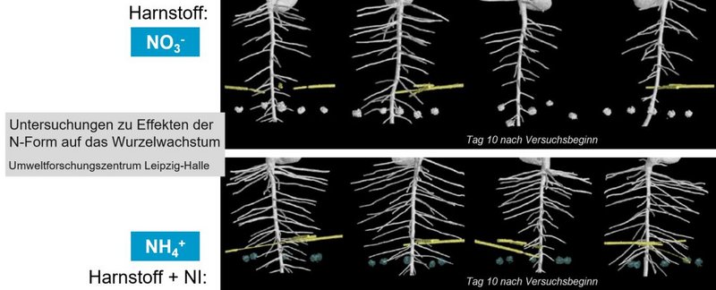 Auxin ist ein essenzielles Pflanzenhormon, das einen maßgeblichen Einfluss auf das Wurzelwachstum hat. Ammoniumstickstoff fördert gezielt die Bildung von Seitenwurzeln, indem er das Auxin-Signal im Wurzelbereich erhöht. Cytokinin wirkt dabei als Gegenspieler zu Auxin. Nitratstickstoff unterstützt die Bildung dieses Pflanzenhormons, das unter anderem die Entwicklung von Nebentrieben anregt. Ein ausgeglichenes Verhältnis beider Hormone bildet die Grundlage für ein gesundes Pflanzenwachstum, da sie als Gegenspieler zahlreiche Wachstumsprozesse steuern. Entsprechend schafft ein ausgewogenes Verhältnis von Ammonium- und Nitratstickstoff im Wurzelraum die Basis dafür. Um dies zu erreichen, ist bei der traditionellen Düngung eine Aufteilung der Gesamtstickstoffmenge in mehrere Gaben sowie in der jeweils passenden Höhe erforderlich. Bei ammoniumstabilisierten Düngern wie ALZON® neo-N erlaubt die gezielte Steuerung des Stickstoffumsatzes eine Zusammenfassung von Teilgaben. Erreicht wird dies durch den Einsatz eines Nitrifikationshemmers, der die Umwandlung von Ammonium zu Nitrat verlangsamt und dadurch eine bedarfsgerechte Versorgung der Pflanzen mit Ammonium- und Nitratstickstoff sicherstellt.