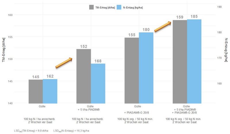 Im Ertrag sind die Stabilisierungseffekte deutlich zu erkennen. Der Einsatz von PIADIN® zu Gülle führte im Mittel über 5 Jahre in verschiedensten Regionen Deutschlands zu einer signifikanten Erhöhung von Ertrag und N-Entzug (Abb. 1).
