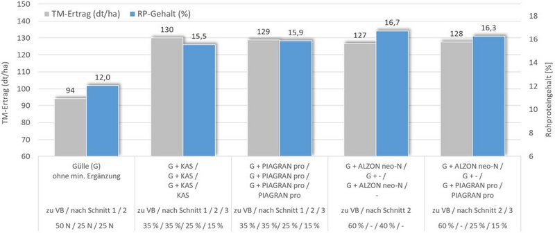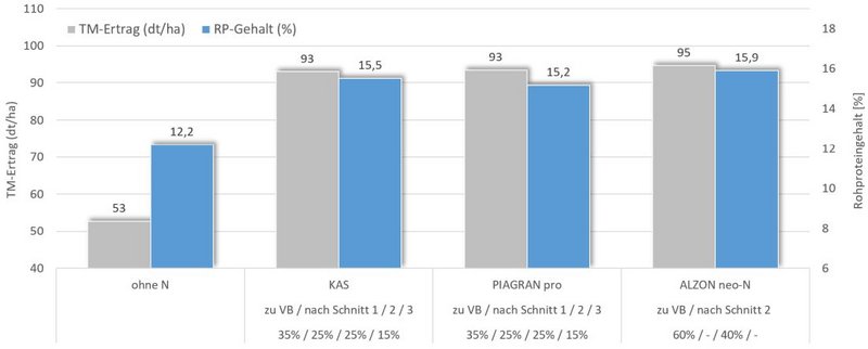 PIAGRAN® pro und ALZON® neo-N, sind bei der Düngung von Grünland als mineralische Stickstoffkomponenten hervorragend geeignet. Die Ertragsleistungen unserer Dünger liegen auf dem Niveau nitratbetonter Dünger. Im Hinblick auf den Rohproteingehalt im Schnittgut und die N-Abfuhr werden in der ammoniumstabilisierten Variante ALZON® neo-N sogar tendenziell bis signifikant bessere Ergebnisse erreicht.
