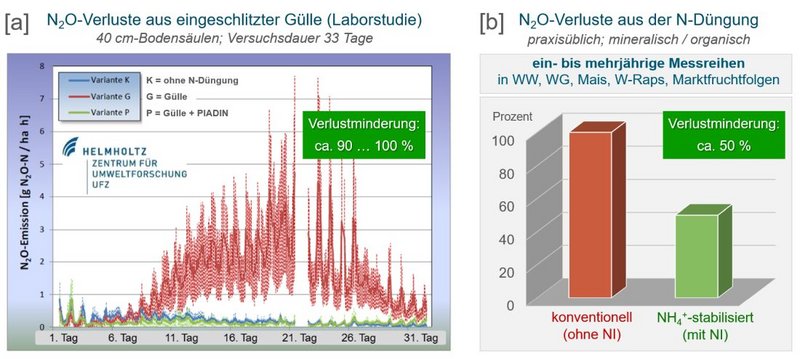 Im Falle eines Einsatzes von Nitrifikationsinhibitoren ergeben sich darüber hinaus durch die empfohlene Zusammenfassung von Teilgaben arbeitswirtschaftliche Vorteile. Zudem werden düngungsbedingte Lachgasemissionen um ca. 50 Prozent reduziert, wodurch ein substanzieller Beitrag zum Klimaschutz erreicht wird. Das Risiko nässebedingter Nitratausträge oder hoher molekularer Sickstoffverluste in der Hauptvegetations- und Düngungsperiode nimmt ebenfalls ab.
