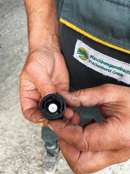 Die Düsen bezieht das Lohnunternehmen von der Firma Lechler. Ursprünglich hatte es für die Ausbringung von Flüssigdünger Mehrlochdüsen im Einsatz. Diese wurden jedoch vom Hersteller aus dem Programm genommen. „Wir nehmen jetzt Standarddüsen und bauen sie in unserem Sinne um“, erzählt Laurenz Friehe. Wie genau das geschieht, will er nicht verraten. Alle Düsen sind herstellerseitig mit einem Tropfenstopp versehen und öffnen erst ab einem Druck von 1 bar. Vor den Löchern in den Düsen sind jeweils Lochplatten platziert. „Muss ich 250 l/ha Flüssigdünger ausbringen, geht das alles problemlos mit 5 bis 6 km/h. Bringe ich aber nur 100 l aus, müsste ich für den passenden Druck in den Leitungen mit 12 km/h durch den Bestand fahren. In solchen Fällen setze ich Düsen mit Lochplatten kleinerer Lochdurchmesser ein“, erläutert der Mitarbeiter. Ebenfalls möglich, aber meist umständlicher, sei ein Beimischen von Wasser unter Beachtung des passenden Mischungsverhältnisses. Aber nicht immer gäbe es beispielsweise eine Wasserquelle in der Nähe.