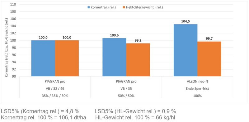 In Abb. 3 sind die Erträge aus drei Versuchen aus den Jahren 2021 bis 2023 dargestellt. Es wurden drei verschiedene Gaben-Strategien auf Ertrag und Hektoliter-Gewicht geprüft. Die Höhe der einzelnen N-Gaben ist relativ zur gesamten Stickstoffmenge abgebildet. In der ersten Variante wurde die Wintergerste zu den traditionellen Terminen mit drei Gaben PIAGRAN® pro gedüngt. In der zweiten Variante wurde PIAGRAN® pro in zwei Gaben, 50 Prozent zum Vegetationsbeginn und 50 Prozent zu BBCH 35, ausgebracht. In der dritten Variante wurde die Ein-Gaben-Strategie mit ALZON® neo-N geprüft. Die N-Düngung erfolgte nach dem Ende der Sperrfrist vor dem Vegetationsbeginn. Die Einmal-Gabe mit ALZON® neo-N erzielte im Durchschnitt der drei Versuchsjahre Mehrerträge von 4 Prozent. Das Qualitätsmerkmal Hektoliter-Gewicht wurde in allen Varianten erreicht. Unterschiede zwischen den Dünge-Strategien waren geringfügig. Die Versuchsergebnisse zeigen, dass Wintergerste den stabilisierten Stickstoff besser umsetzen kann. Die gesamte N-Menge vor Vegetationsbeginn führt zu einer verbesserten N-Effizienz, was auch einen positiven Effekt auf die Umwelt hat.