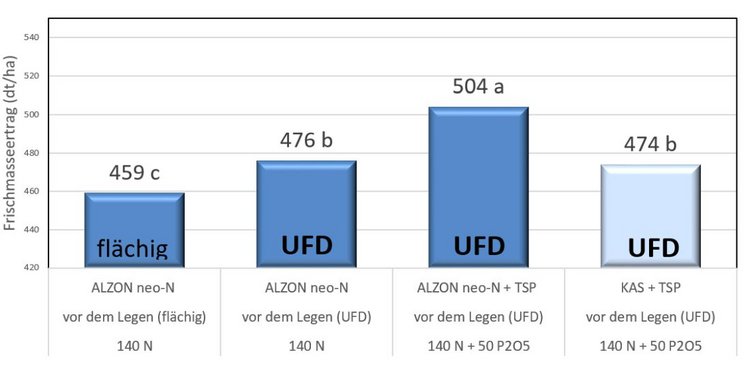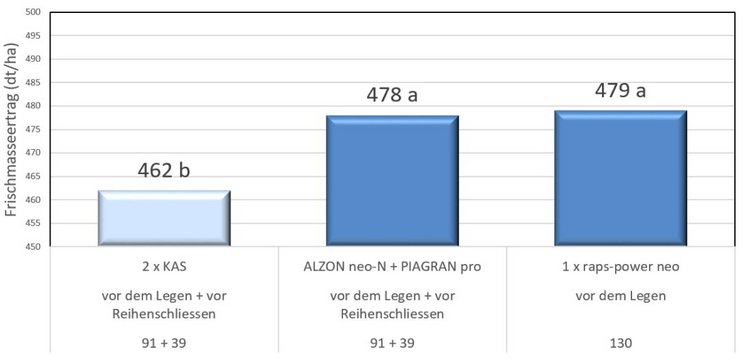 Bereits vor der Verfügbarkeit leistungsfähiger Nitrifikationsinhibitoren wurden Effekte der lokalen pH-Wert-Absenkung im Boden zumindest in Ansätzen genutzt, indem schwefelsaures Ammoniak (SSA) als besonders vorteilhafter Kartoffel-Dünger zum Einsatz kam. Heute lassen sich Schwefelversorgung und Ammoniumstabilisierung in idealer Form kombinieren. Hierfür bieten sich raps- aber auch getreide-power® neo-N oder Flüssigdünger mit Schwefel wie ALZON® flüssig-S 25/6 oder ALZON® flüssig-S 22/4 an. Aktuelle Versuchsergebnisse zeigen einmal mehr die Leistungsfähigkeit solcher Systeme (Abb. 1).