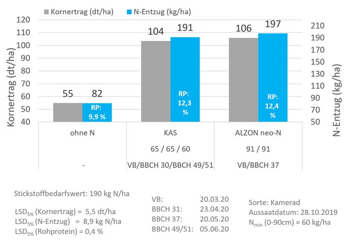 Wer ammoniumstabilisierte Dünger anwendet, kann diese Phase umgehen, indem er das erst reichliche, dann rasch verschwindende Wasserangebot rechtzeitig mit einer erhöhten Startgabe ausnutzt. Sollten wider Erwarten doch anhaltend nasse Bedingungen oder ein später Märzwinter das Sagen haben, unterliegt dieser bereits applizierte stabilisierte Dünger weder dem Risiko einer Nitrat-Auswaschung, noch klimaschädlichen Lachgasemissionen. So lassen sich mit ALZON® neo-N oder Düngermischungen (raps-power® neo und getreide-power® neo) regelmäßig höhere Erträge und Stickstoffentzüge erzielen (Abb. 2).