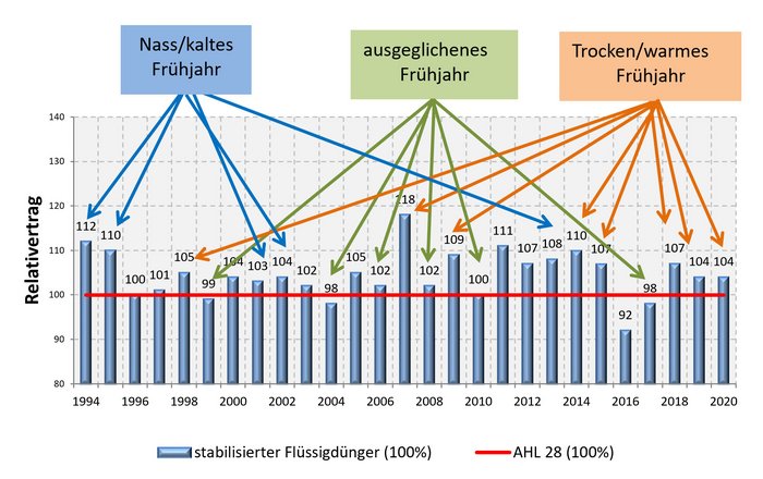 Vorteile und mit ihnen einhergehende Mehrerträge sind gerade unter schwierigen Bedingungen stärker ausgeprägt als bei ausgeglichenen Verhältnissen (Abb.1). Bei kleiner werdenden Zeitfenstern für eine optimale Stickstoffbereitstellung im Wurzelraum sind stabilisierte Dünger eine Basis für stabile und hohe Erträge. Dadurch wird eine bessere Stickstoffausnutzung gewährleistet.